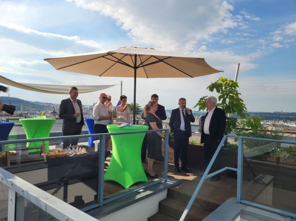 Neformální diskuse za účasti Prof. Ing. Richarda Hindlse, CSc., dr. Hc a Doc. Ing. Illony Švihlíkové PhD a raut na střešní terase sídla Coface událost zakončil.
