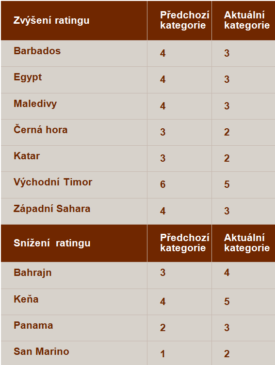 Credendo změnilo v rámci pravidelného hodnocení krátkodobého politického rizika rating některých zemí. Pozitivní změnu (zvýšení ratingu) zaznamenaly Barbados, Egypt, Maledivy, Černá Hora, Katar, Východní Timor a Západní Sahara, negativní trend (snížení ratingu) pak Bahrajn, Keňa, Panama a San Marino.